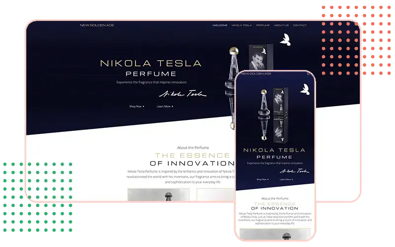 Screenshot of the Nikola Tesla Perfume website shown on desktop and mobile devices